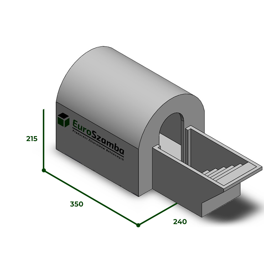 Piwnica betonowa płaska o wymiarach 350 × 240 × 215 cm z przedsionkiem otwartym i schodami to największy model w tej kategorii, zaprojektowany z myślą o maksymalnym komforcie i przestrzeni magazynowej. Dzięki wydłużeniu komory głównej do 3,5 metra, piwnica oferuje ogromną powierzchnię użytkową, idealną dla dużych gospodarstw domowych lub pasjonatów winiarstwa. Zintegrowany system schodów betonowych prowadzących do otwartego przedsionka eliminuje barierę wejścia, pozwalając na swobodne wnoszenie dużych skrzyń czy worków z plonami. Płaski dach konstrukcji umożliwia dyskretne wkomponowanie piwniczki w teren ogrodu – może ona zostać całkowicie zakopana pod trawnikiem lub stanowić fundament pod taras bądź altanę.