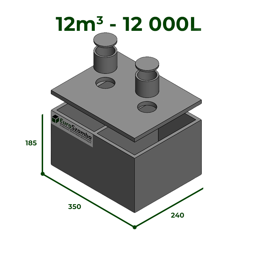 Szambo betonowe dwukomorowe 12 m³ w wersji niskiej (niskoprofilowej) to specjalistyczny zbiornik prefabrykowany zaprojektowany do retencji i wstępnego oczyszczania ścieków w trudnych warunkach geologicznych. Dzięki zwiększonej powierzchni podstawy (350×240 cm) i zredukowanej wysokości (185 cm), model ten pozwala na zachowanie dużej objętości przy stosunkowo płytkim posadowieniu. Jest to kluczowe na terenach, gdzie wysoki poziom wód gruntowych uniemożliwia montaż standardowych, wysokich zbiorników. Monolityczna konstrukcja żelbetowa z wewnętrzną przegrodą zapewnia pełną szczelność oraz odporność na napór gruntu i siły wyporu wody.